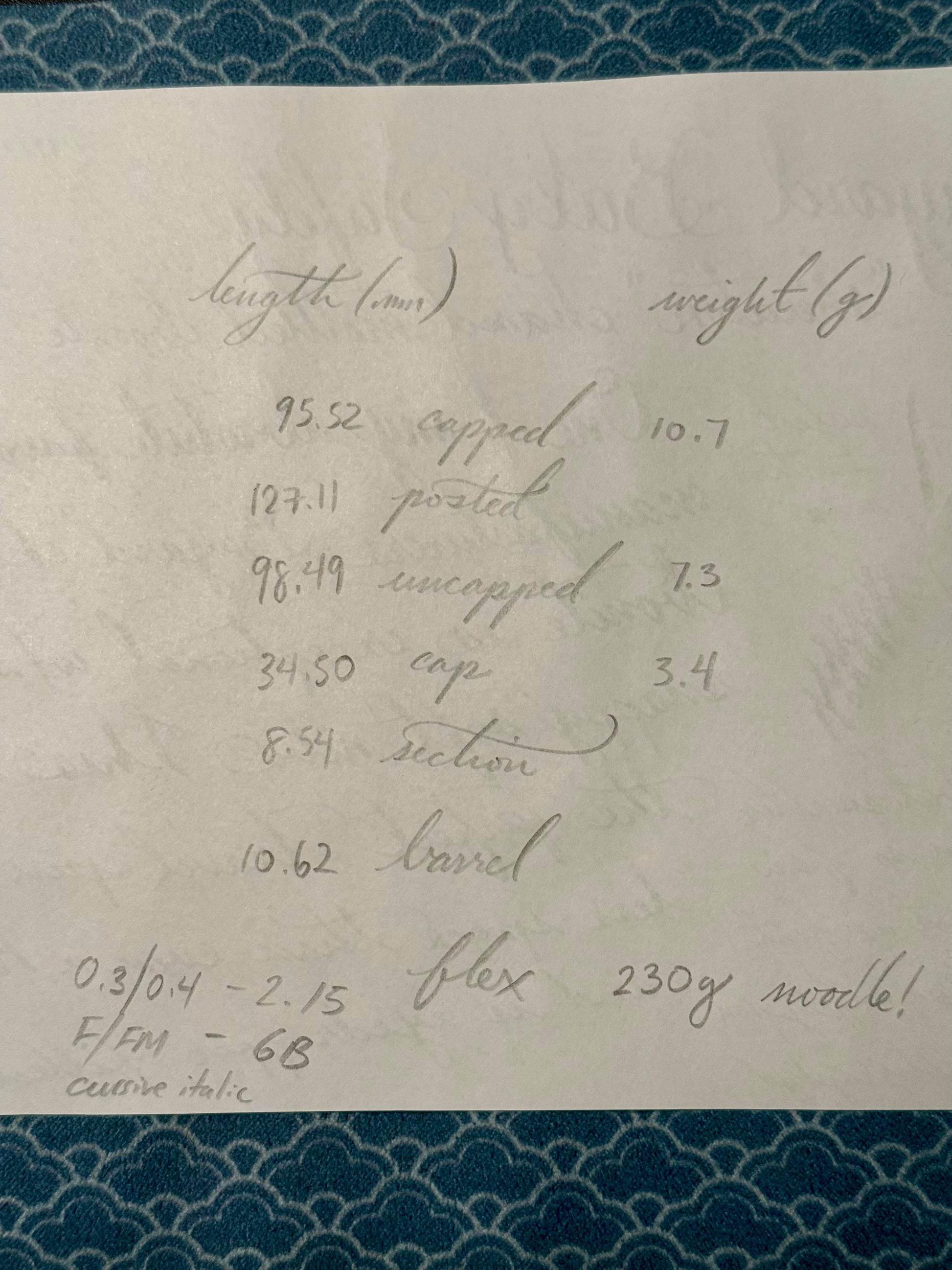 Nib flexibility is such a controversial topic, but there needs to be some level of consistency so please take this table as a frame of reference for my restorations and as someone who is writing in a calligraphic/spencerian style of cursive script. Without objective measurements, flexibility terms such as wet noodle are useless as someone with stronger forearms and grip strength will make even manifold nibs into a wet noodle.