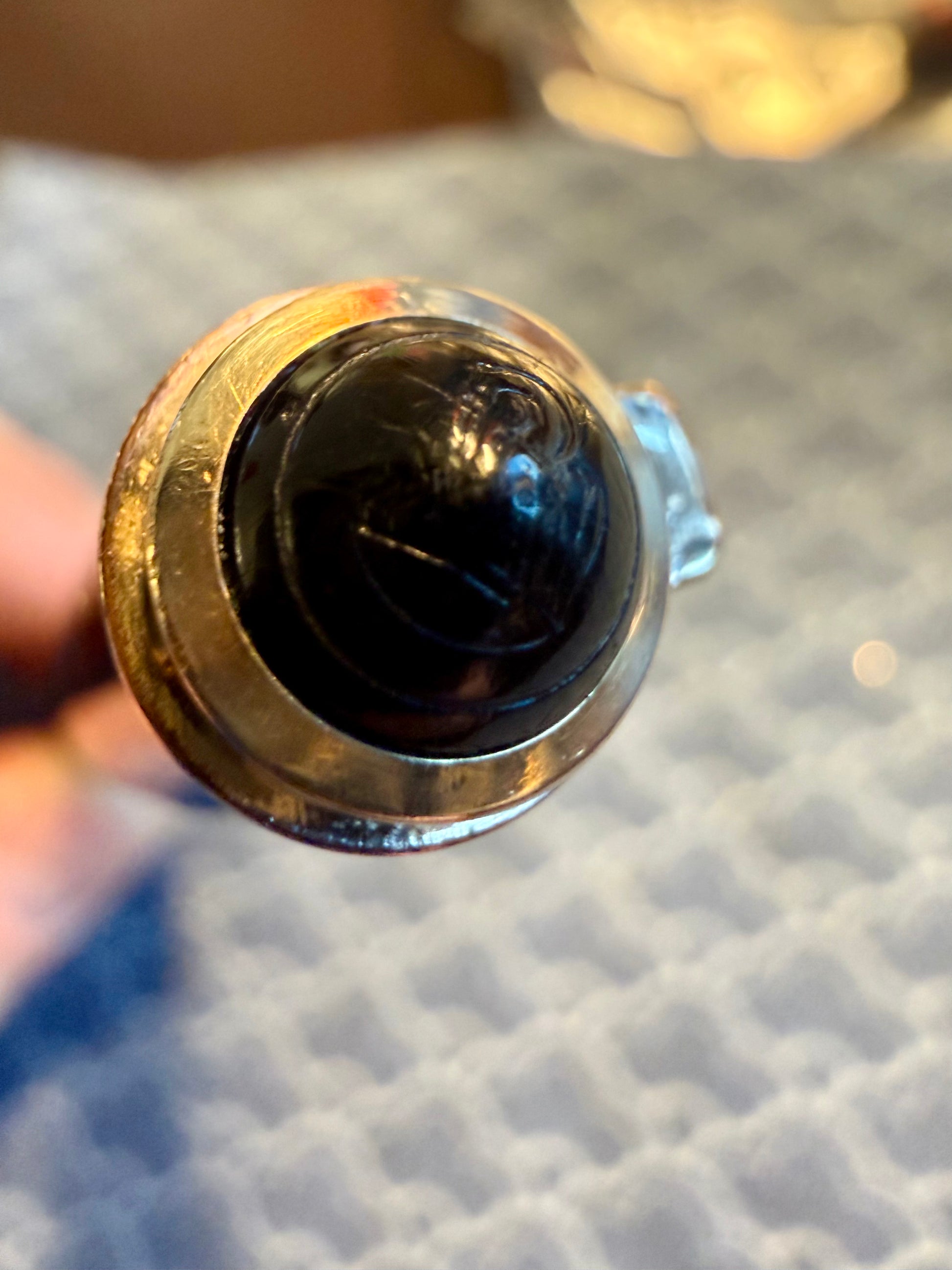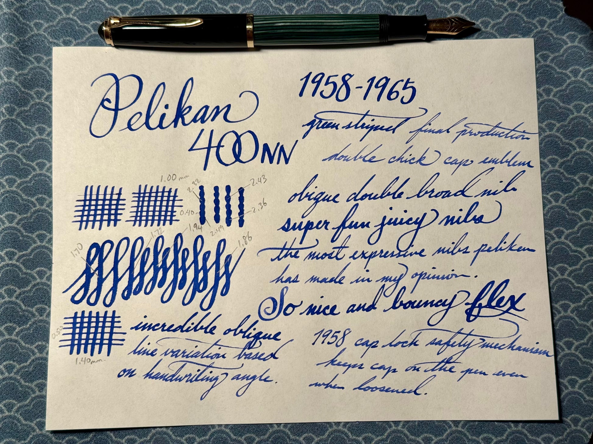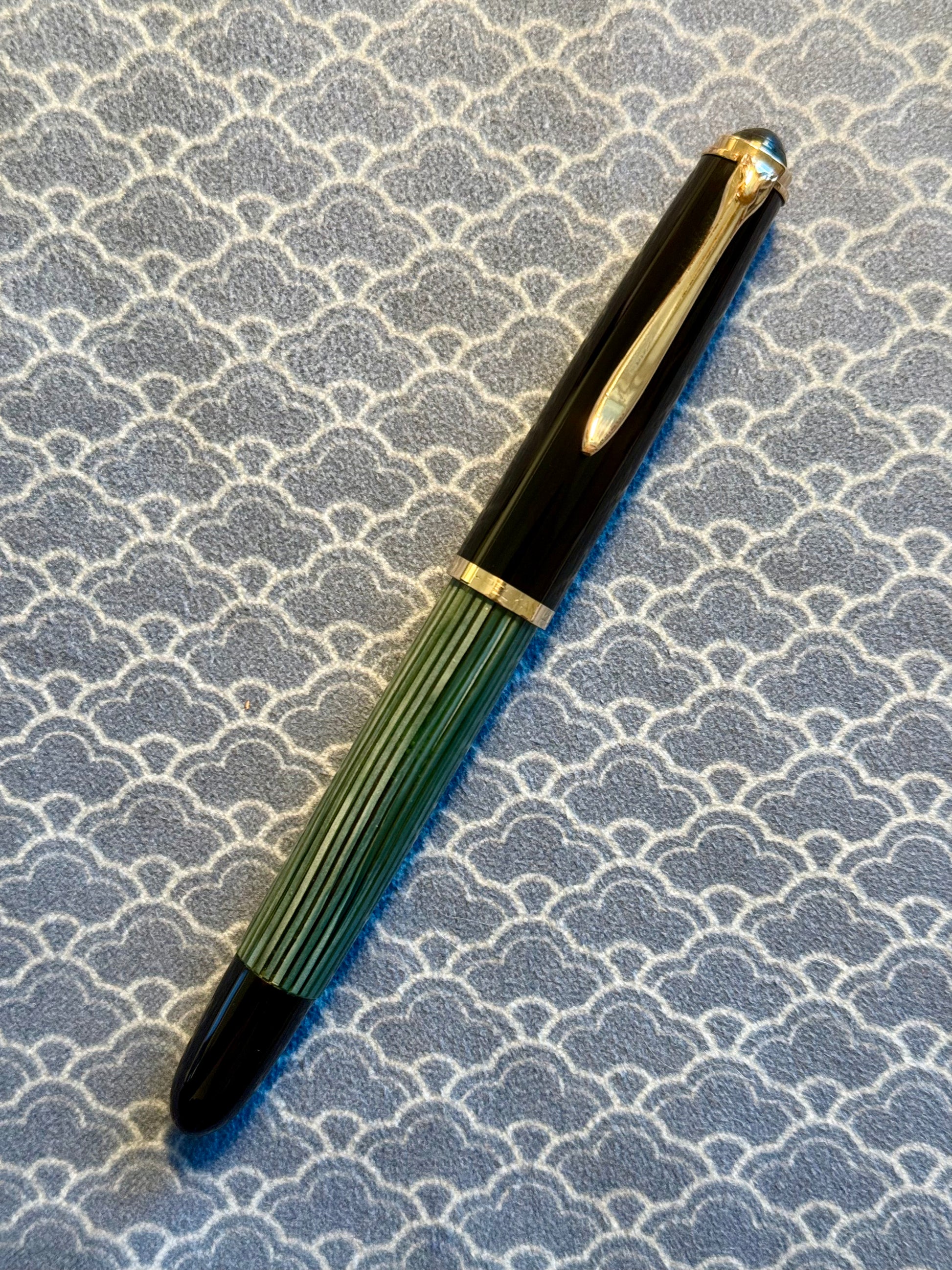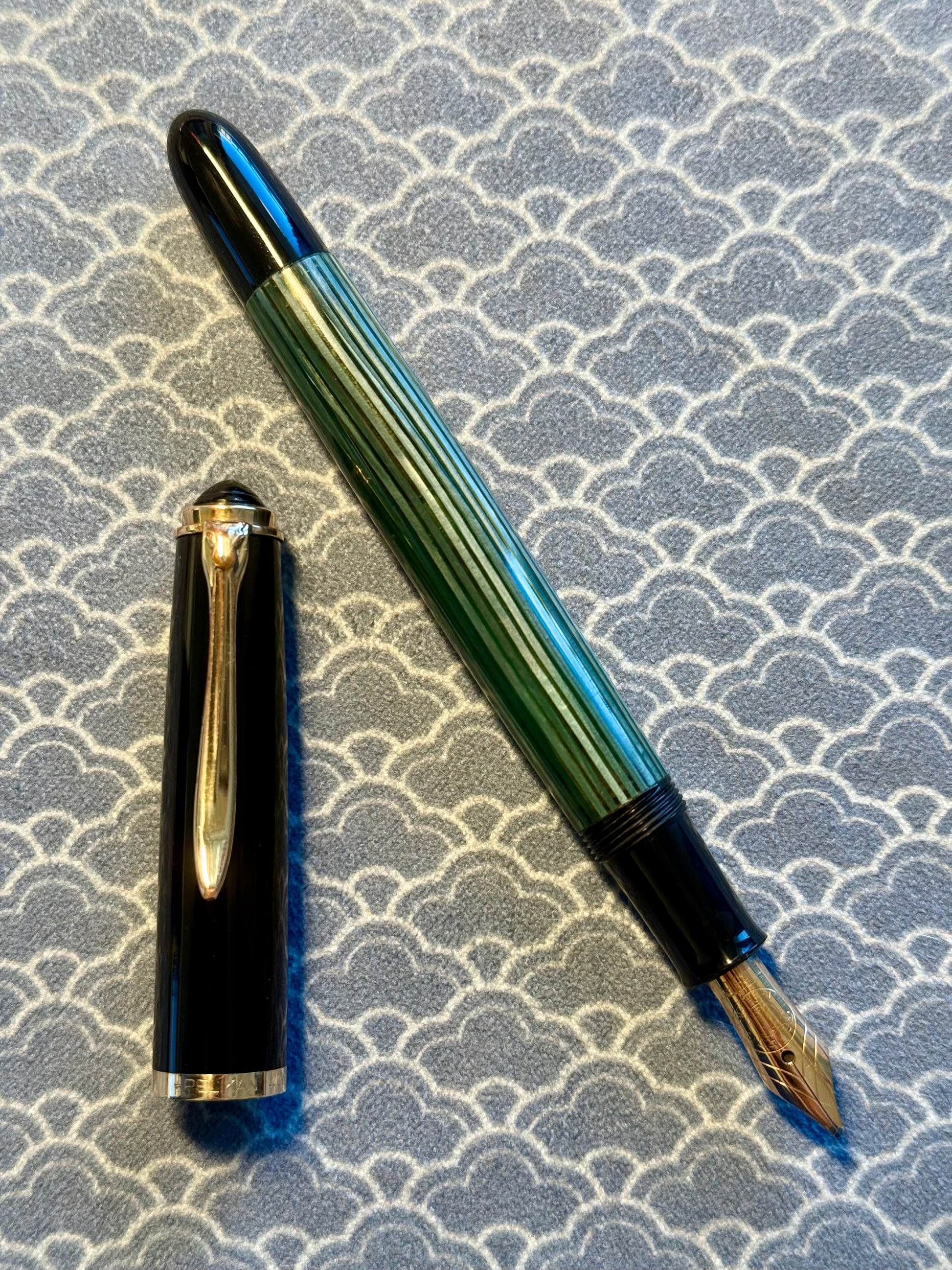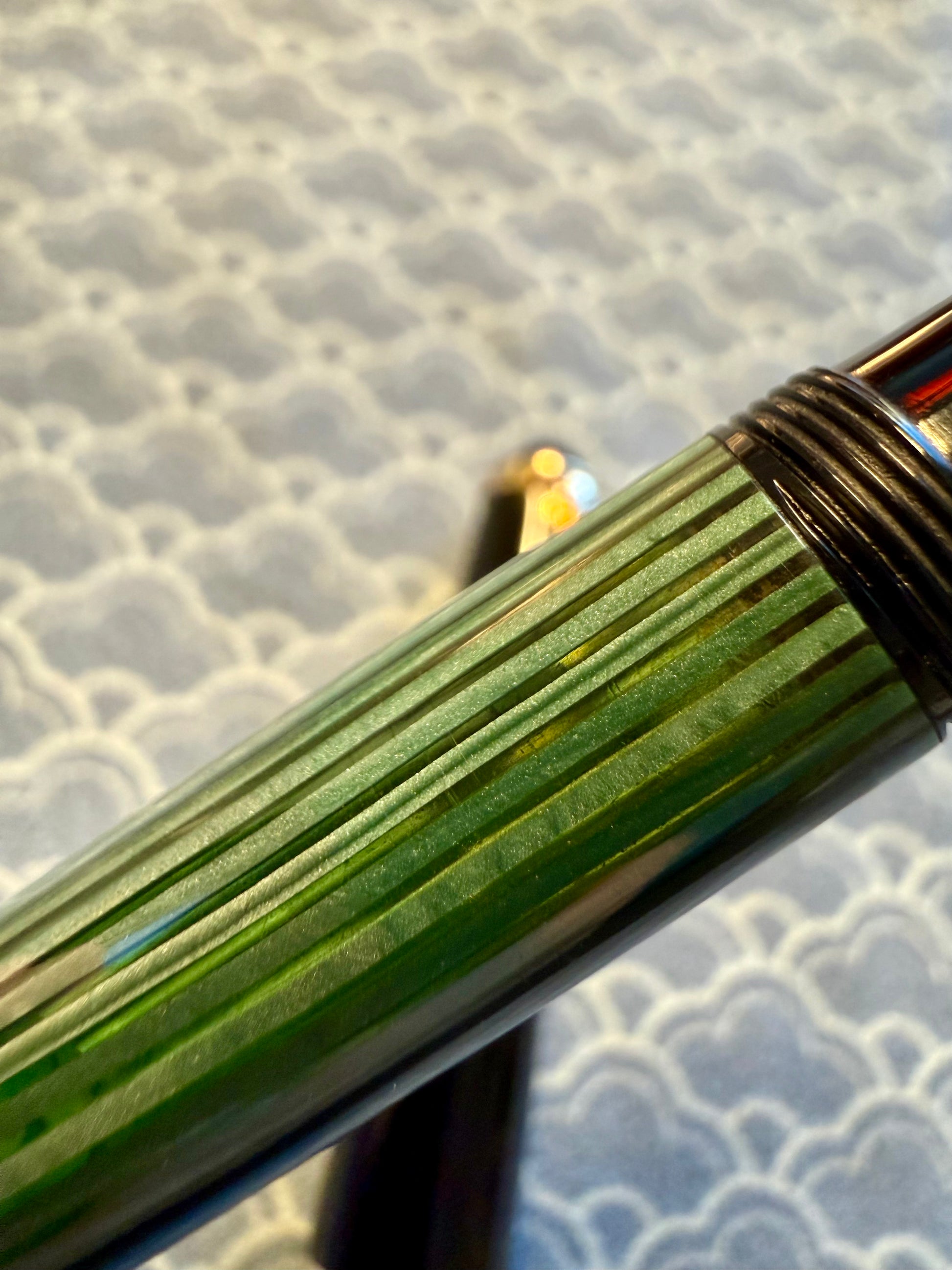 While the pointed dome 400NN (double chicks) was produced from 1956 to 1965, this particular 400NN was produced after 1958 as it deploys a safety mechanism in the cap where there is a skip in the cap threading that allows the cap to stay on even when not fully turned taught. These torpedo shaped Pelikans were the longest of the 400 series and of the last vintage production pens with the classic green celluloid nitrate binde (thin celluloid nitrate sheet wrapped around a transparent barrel).