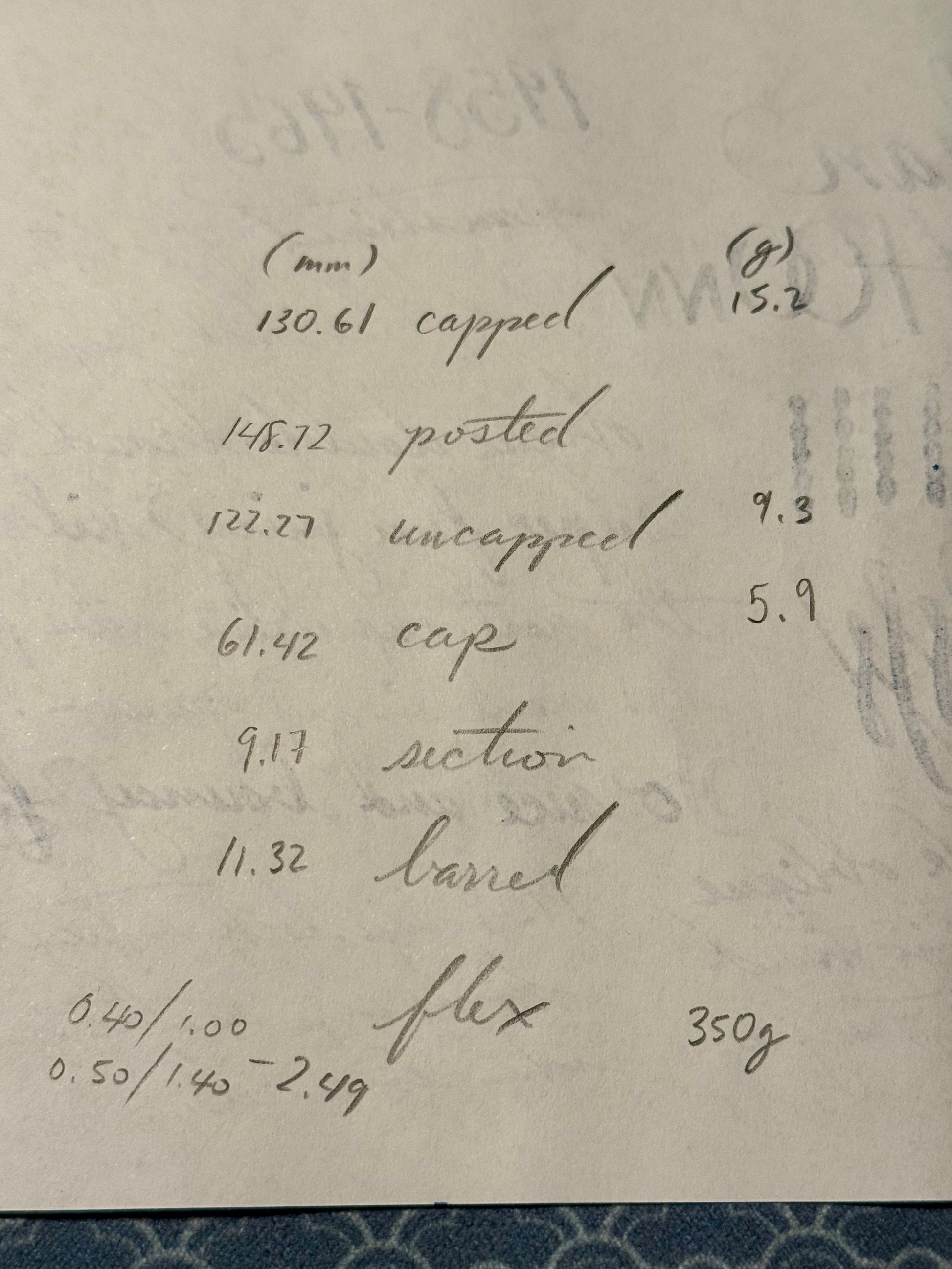 Nib flexibility is such a controversial topic, but there needs to be some level of consistency so please take this table as a frame of reference for my restorations and as someone who is writing in a calligraphic/spencerian style of cursive script. Without objective measurements, flexibility terms such as wet noodle are useless as someone with stronger forearms and grip strength will make even manifold nibs into a wet noodle.