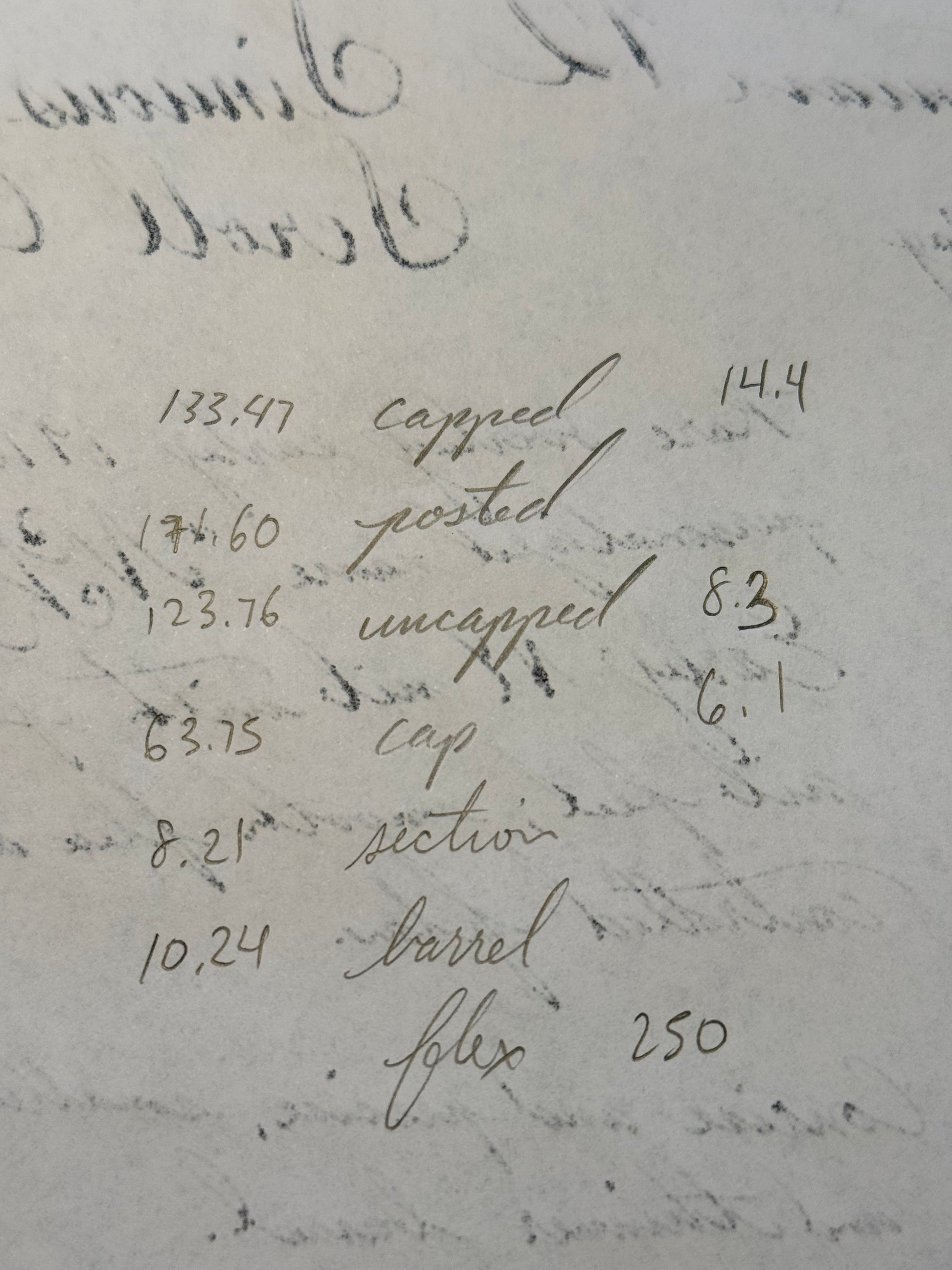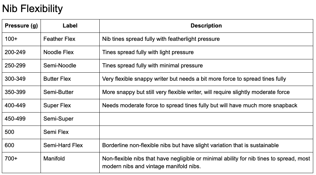 Nib flexibility is such a controversial topic, but there needs to be some level of consistency so please take this table as a frame of reference for my restorations and as someone who is writing in a calligraphic/spencerian style of cursive script. Without objective measurements, flexibility terms such as wet noodle are useless as someone with stronger forearms and grip strength will make even manifold nibs into a wet noodle.