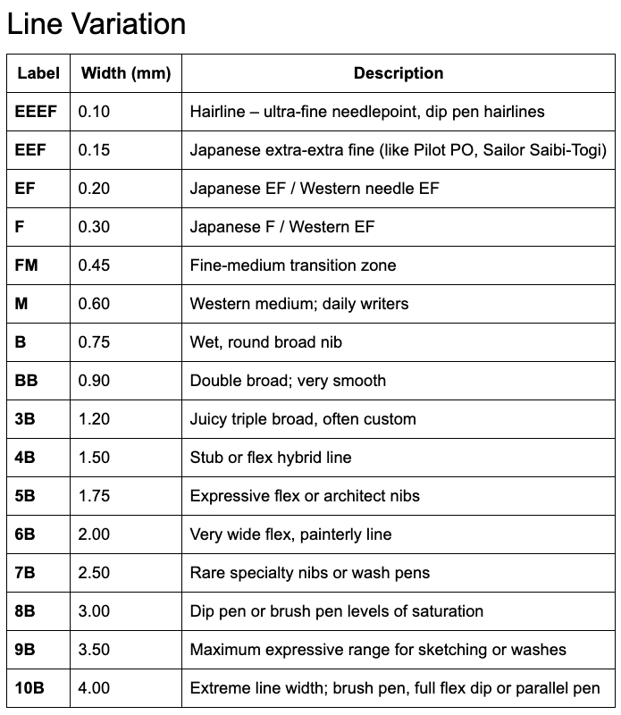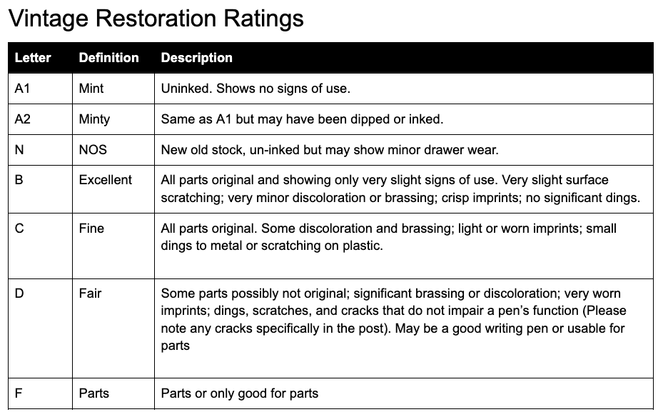 Different restorers have different standards for line sizing and especially for vintage pens, the printed tipping size will not always be accurate due to repairs/grinds/etc. Please use this as a frame of reference for consistency.