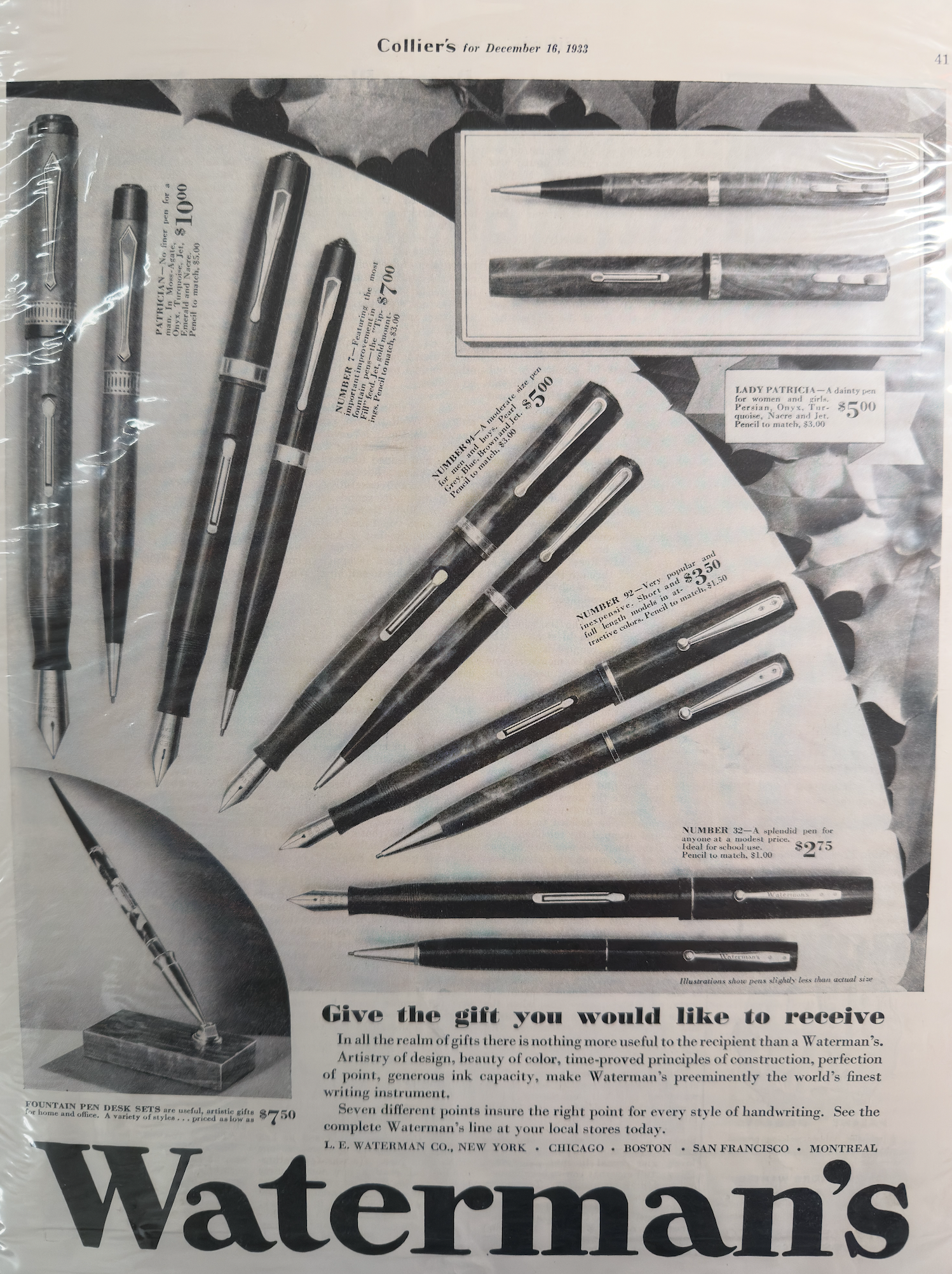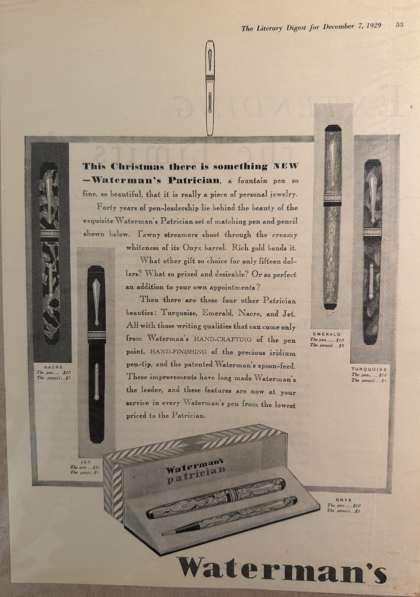 - The Patrician lineup was introduced in 1929 by Waterman's as their flagship model made of extremely premium celluloid nitrate in bright colors: jet black, onyx, turquoise, emerald, nacre, and moss agate. In typical mass market fashion, there were two skews: the larger Senior Patrician and the smaller Lady Patricia. The 1/2 (thinner), V (shorter), 1/2V (thin and short) models of many Waterman's pens were made to target this later demographic of women who preferred smaller pens for ease of carry in handbags and smaller pockets, this Lady Patricia follows the same sizing as a 52 1/2V.